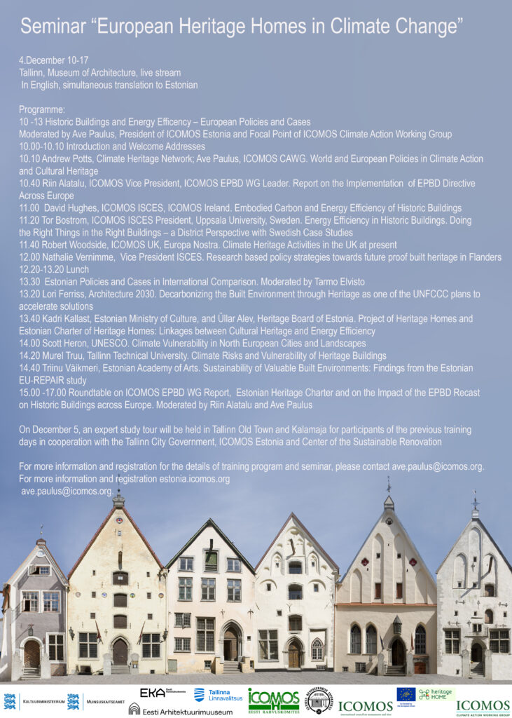 3.‒5. detsembril korraldab rahvusvahelise muinsuskaitse eksperte ühendava organisatsiooni ICOMOS Eesti komitee koostöös ICOMOS kliima ja pärandi töögrupi, ICOMOS Euroopa energiadirektiivi töögrupi, ICOMOS energiatõhususe teaduskomitee, Tallinna linnavalitsuse, Muinsuskaitseameti ja Kultuuriministeeriumi, projekti LIFE heritageHOMES meeskonna ning mitme muu partneriga kliima ja pärandi koolitusprogrammi koos avatud seminariga. Tallinnas ja veebis toimuv koolitus ja seminar on suunatud Eesti ja Põhjamaade pärandispetsialistidele ja -kogukondadele.