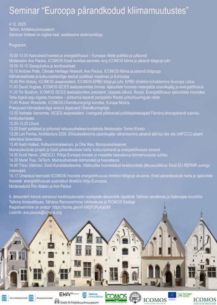 3.-5. detsembril korraldab rahvusvahelise muinsuskaitse ekspertorganisatsiooni ICOMOS Eesti komitee koostöös ICOMOS kliima ja pärandi töögrupi, ICOMOS Euroopa energiadirektiivi töögrupi, ICOMOS energiatõhususe teaduskomitee, Tallinna linnavalitsuse, Muinsuskaitseameti ja Kultuuriministeeriumiga, projekti Life HeritageHomes meeskonna ning mitmete teiste partneritega kliima ja pärandi koolitusprogrammi koos avatud seminariga. Tallinnas ja veebis toimuv koolitus ja seminar on suunatud Eesti ja Põhjamaade pärandispetsialistidele,ja -kogukondadele.